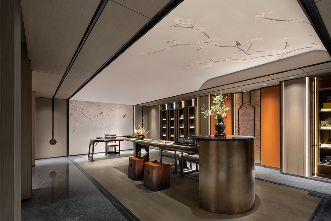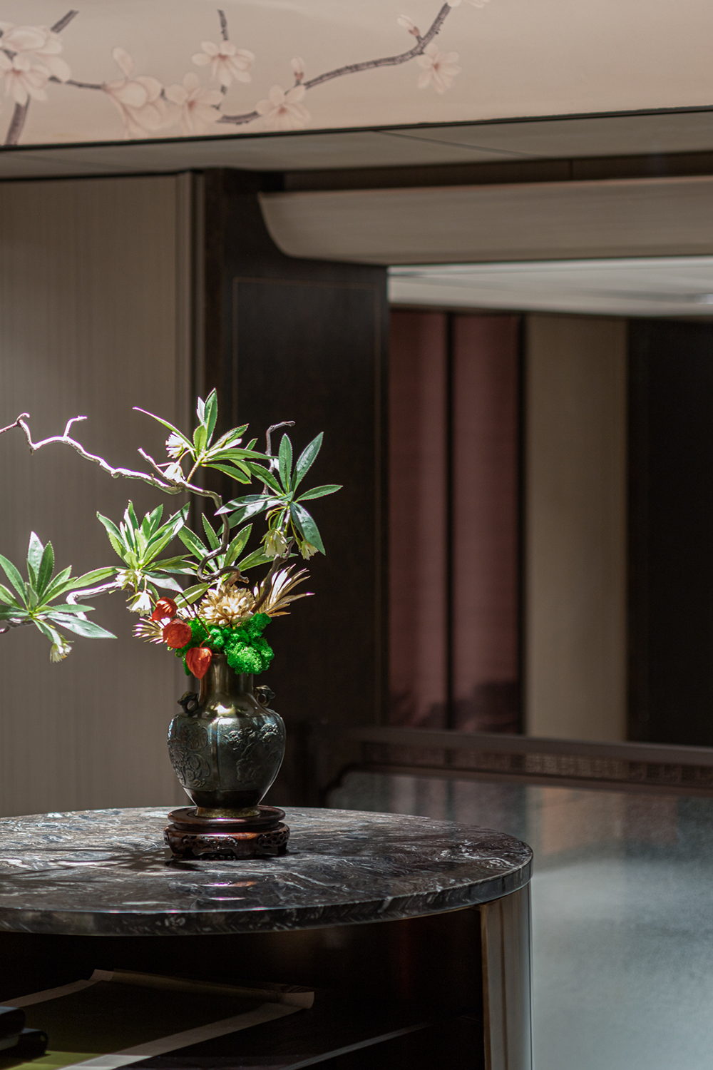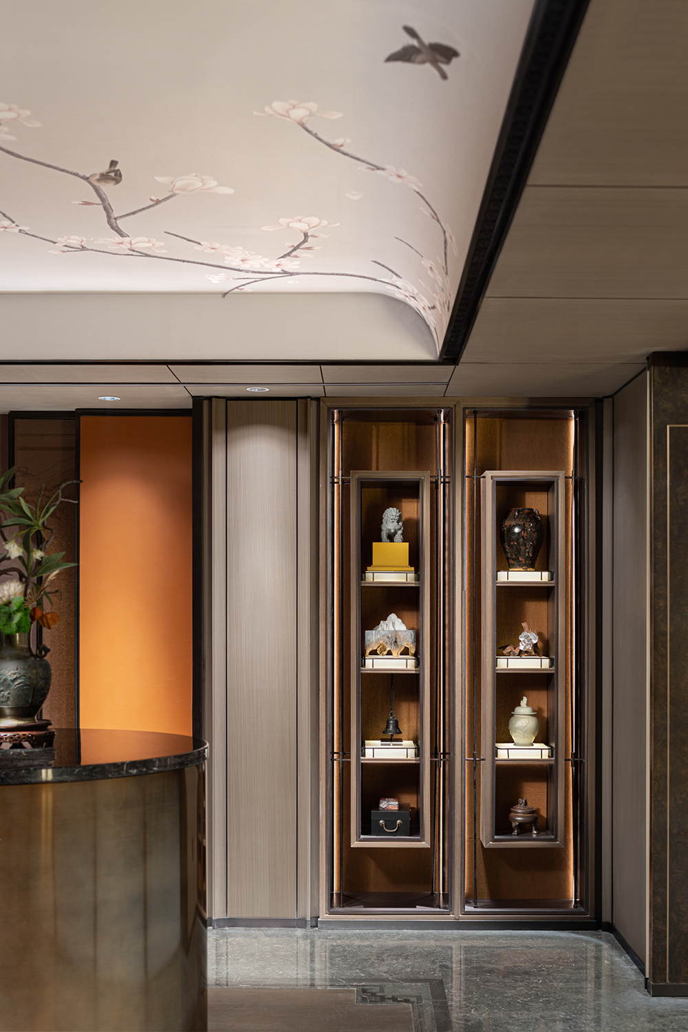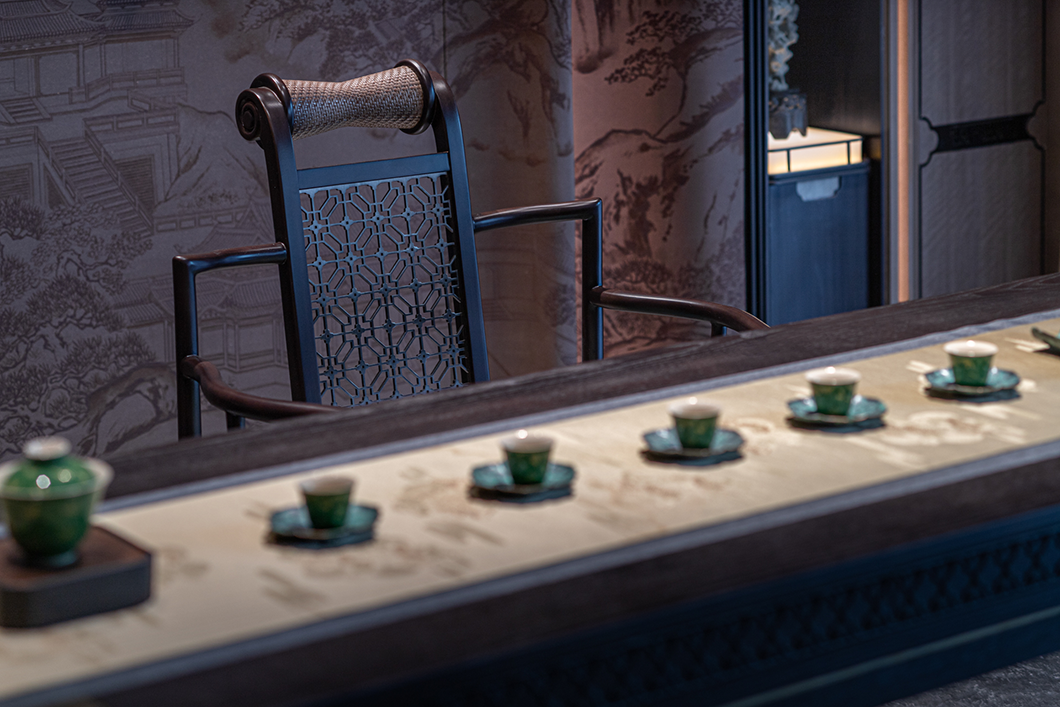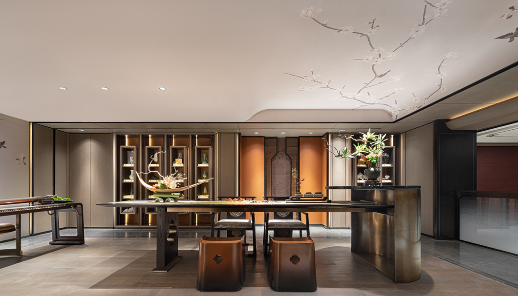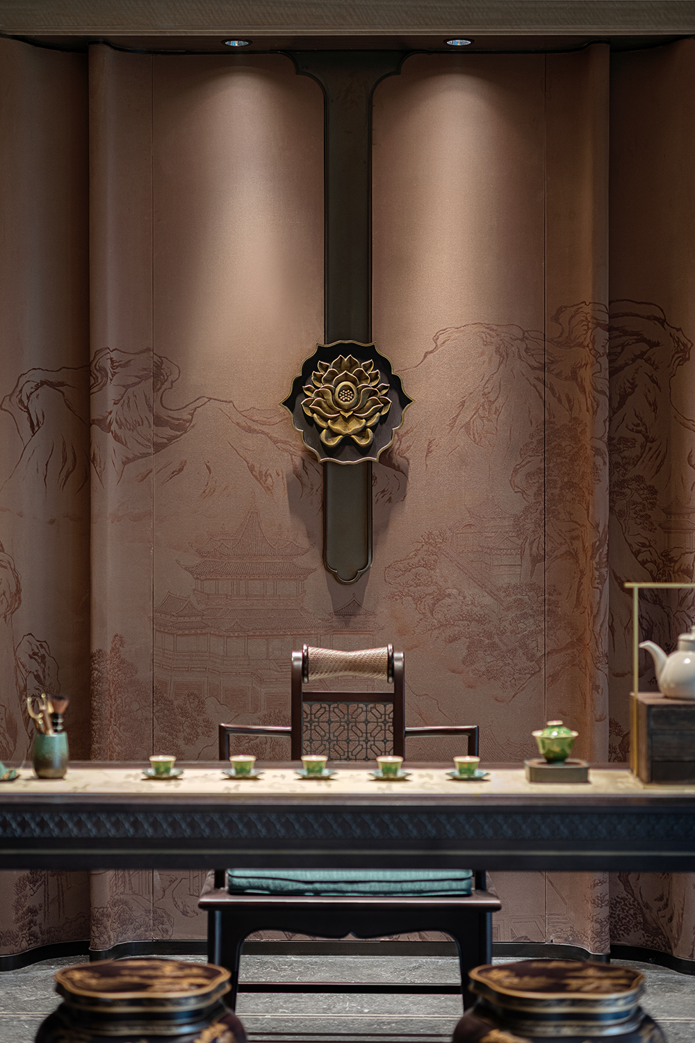 弧形屏幕展开,中式木槿。运用曲线和花卉符号来演绎和表达木槿的富贵与美丽。温柔而深邃的氛围反映了文明的辉煌,几只青瓷茶碗展示了空间的休闲尺度,为空间增添了艺术氛围。