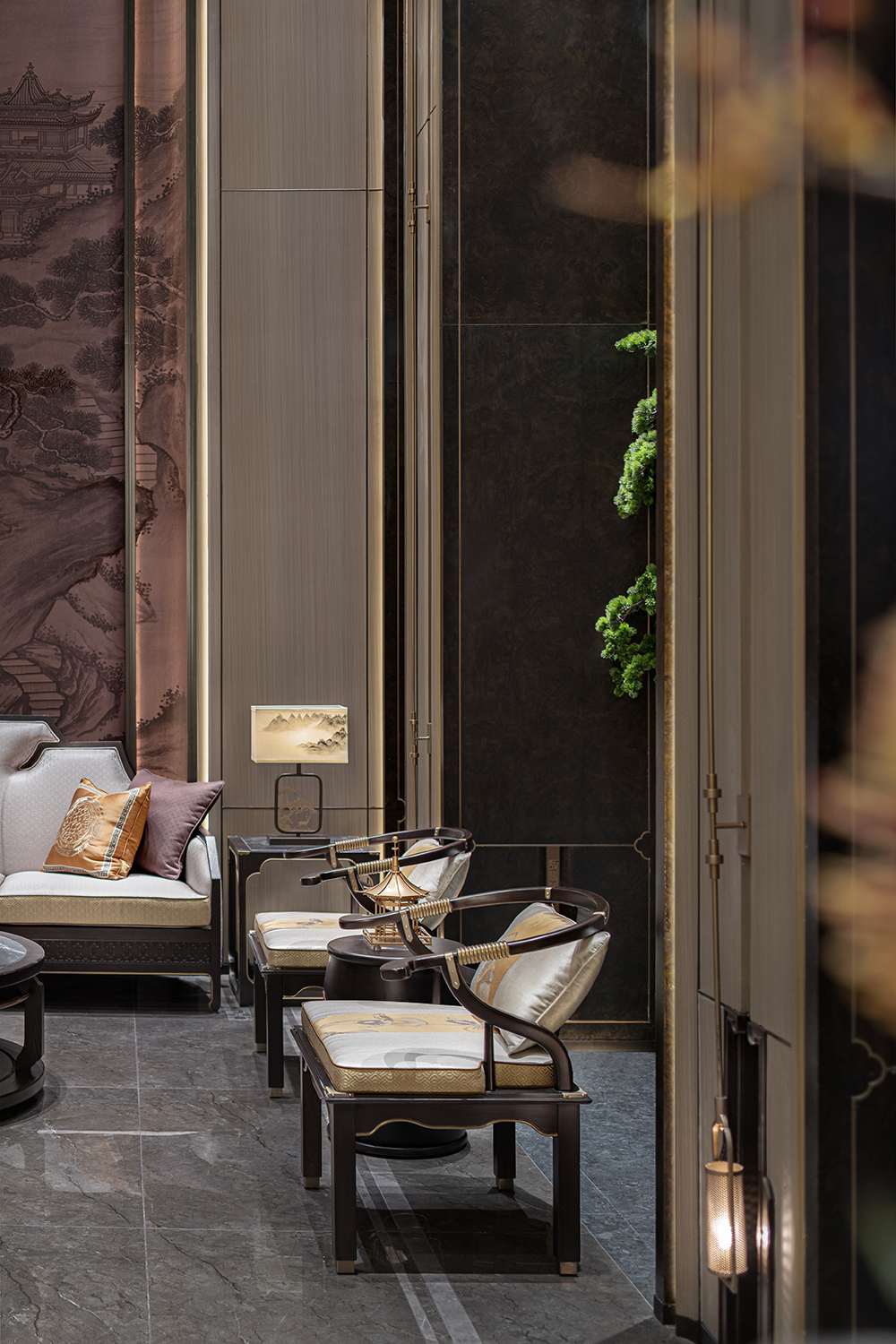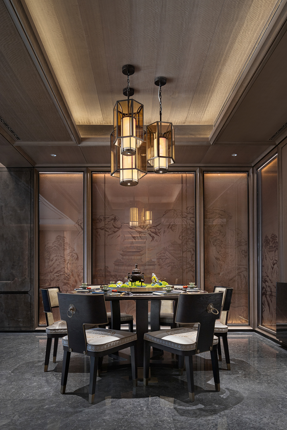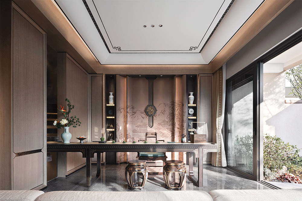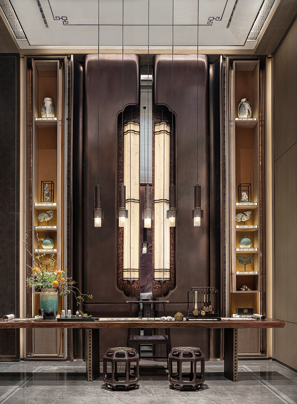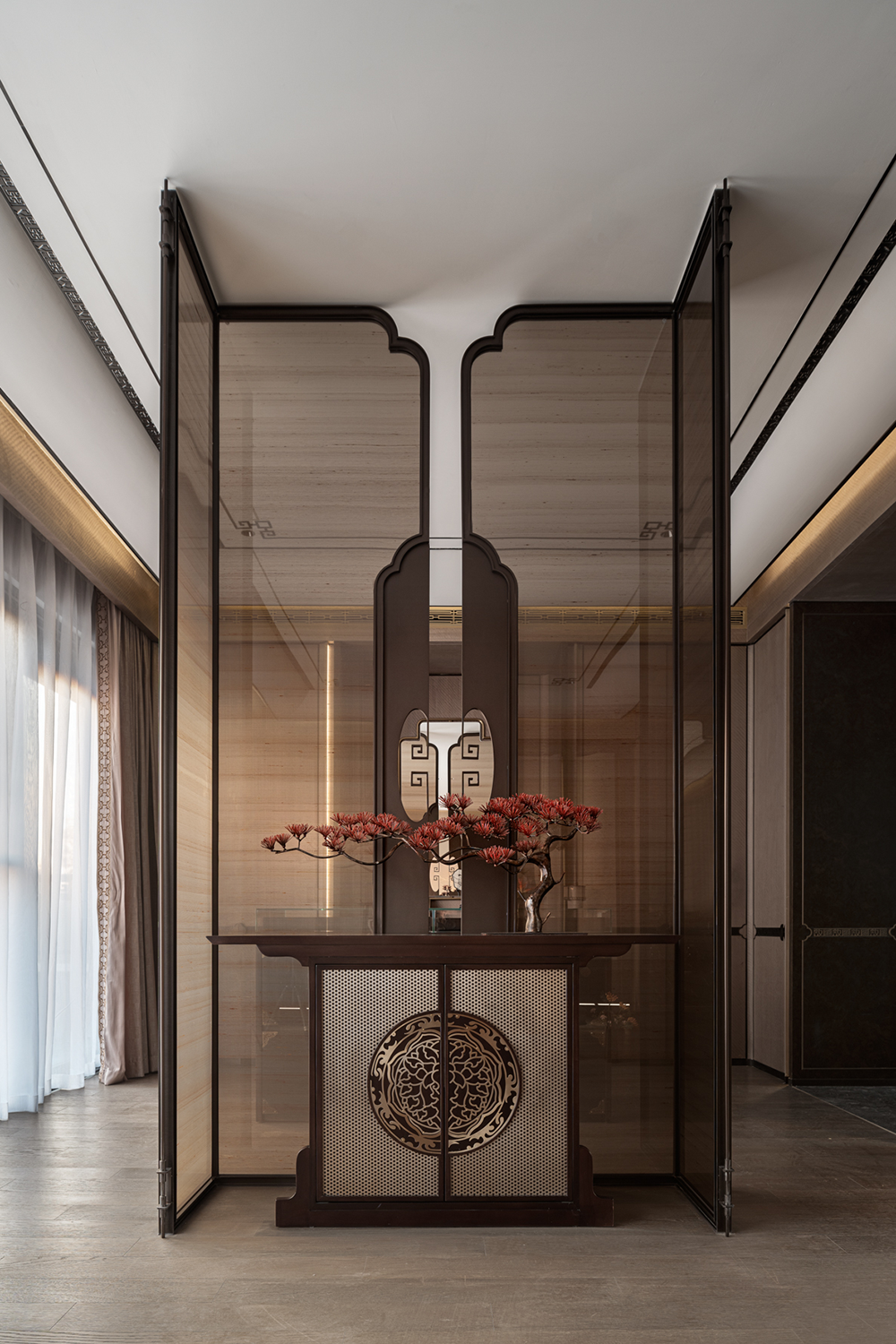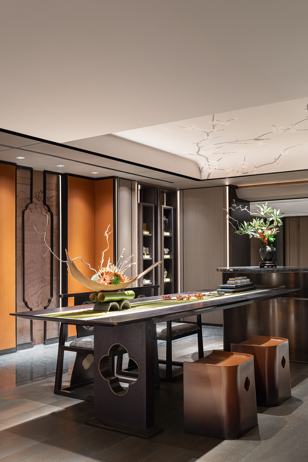 弧形屏幕展开,中式木槿。运用曲线和花卉符号来演绎和表达木槿的富贵与美丽。温柔而深邃的氛围反映了文明的辉煌,几只青瓷茶碗展示了空间的休闲尺度,为空间增添了艺术氛围。