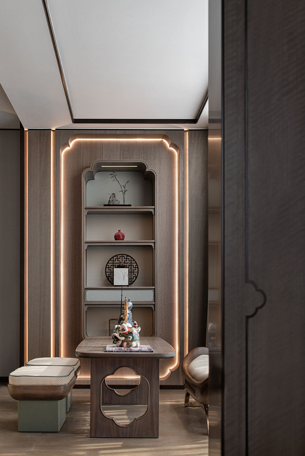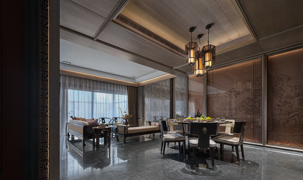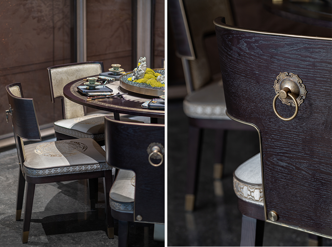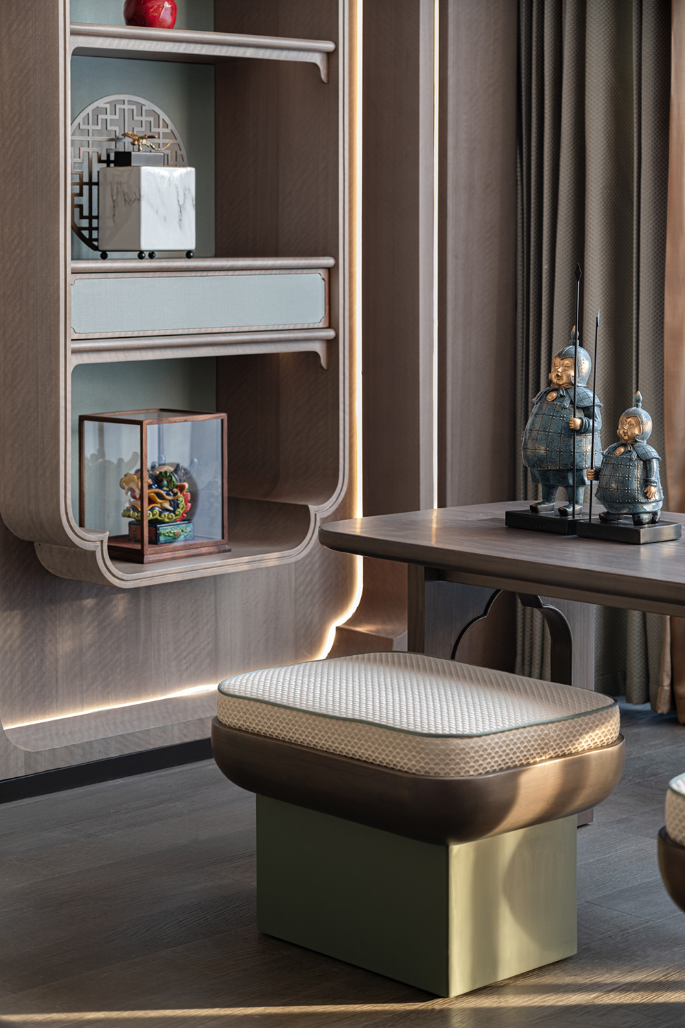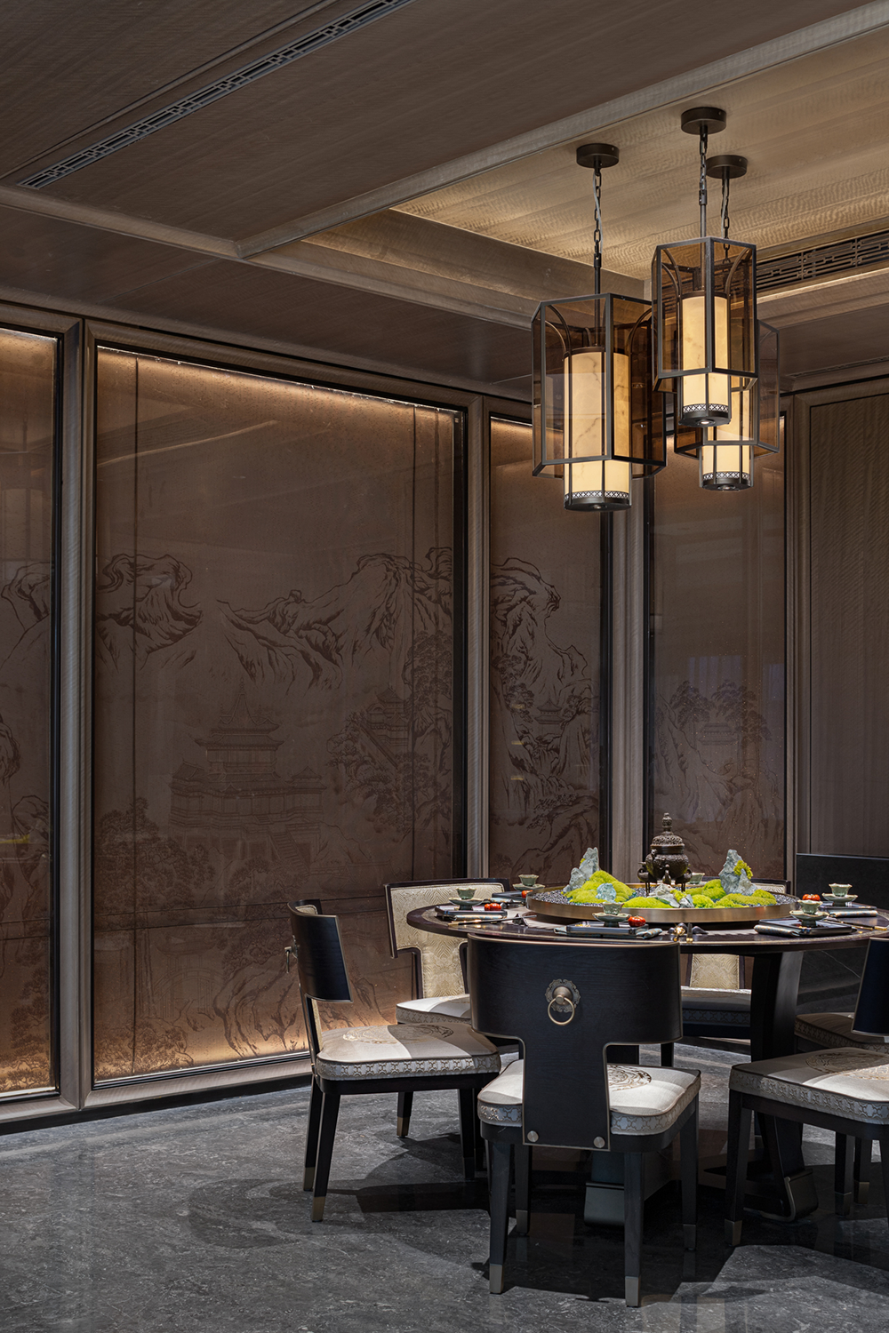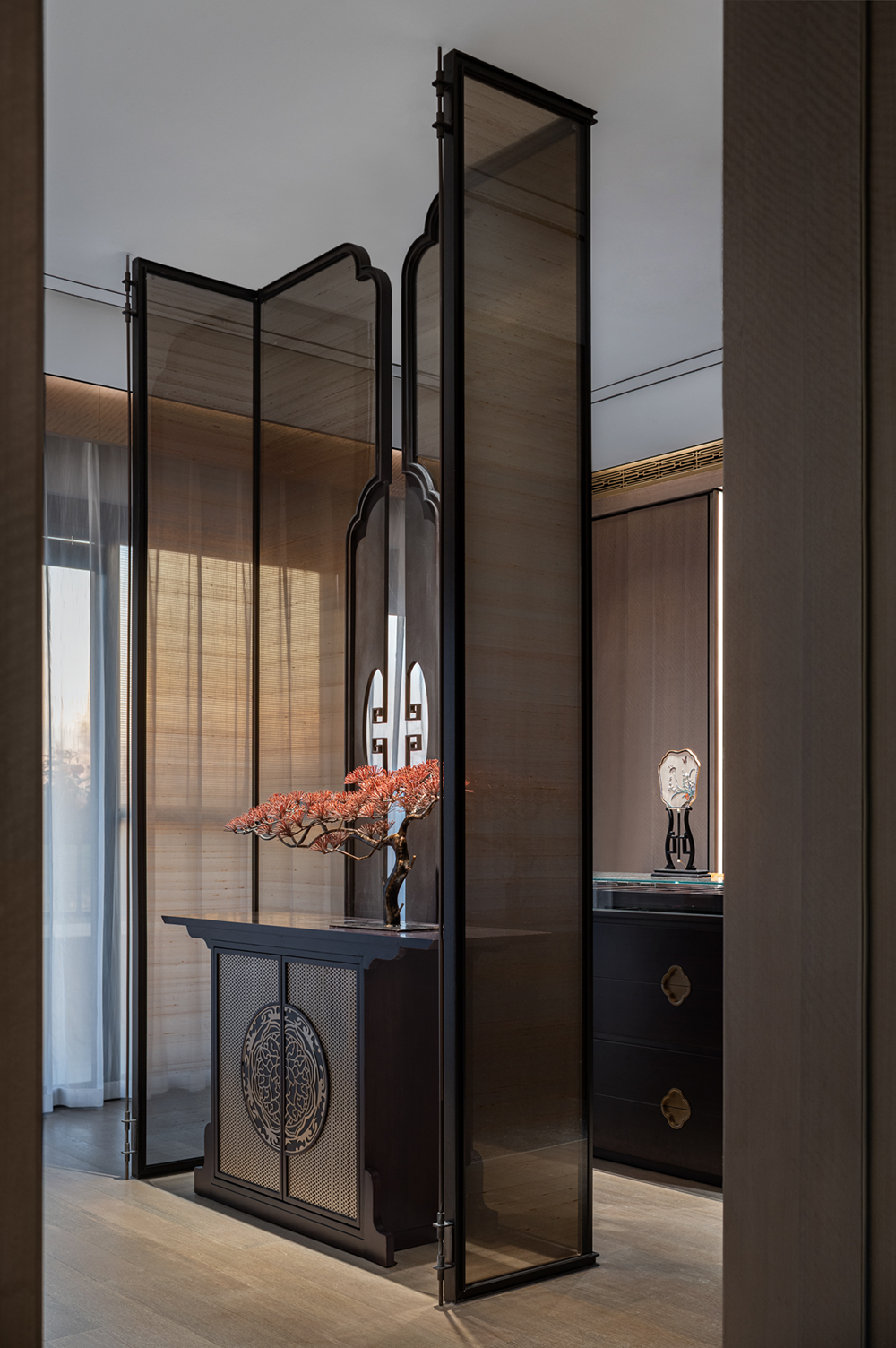 弧形屏幕展开,中式木槿。运用曲线和花卉符号来演绎和表达木槿的富贵与美丽。温柔而深邃的氛围反映了文明的辉煌,几只青瓷茶碗展示了空间的休闲尺度,为空间增添了艺术氛围。
