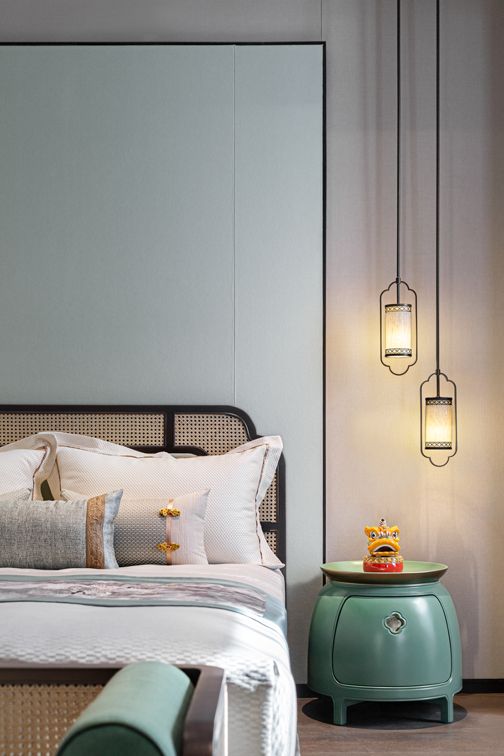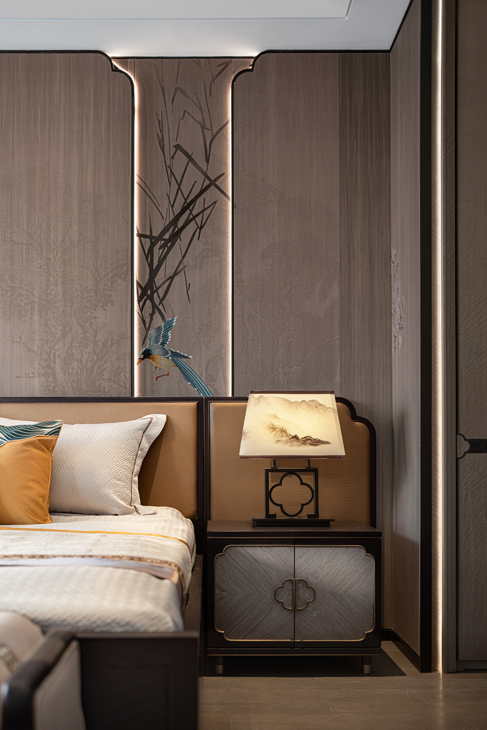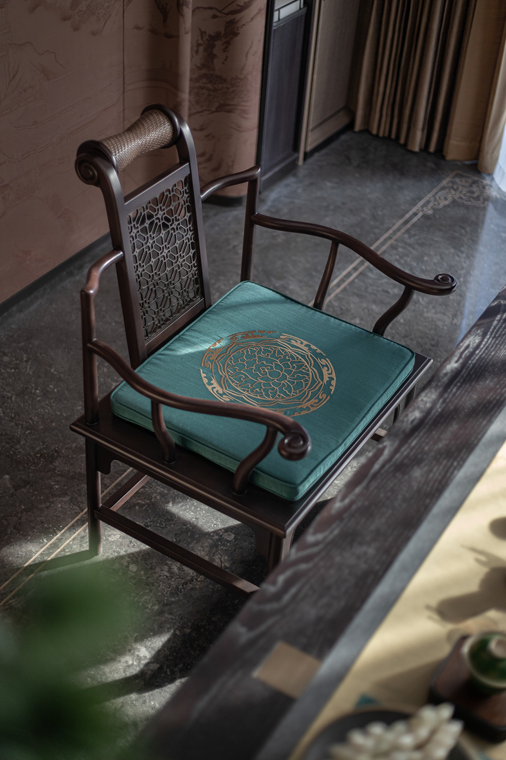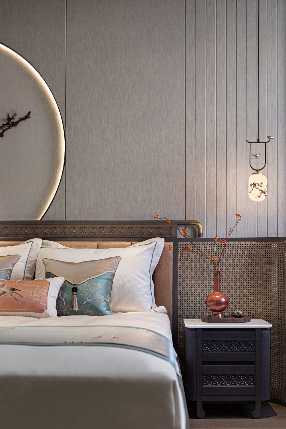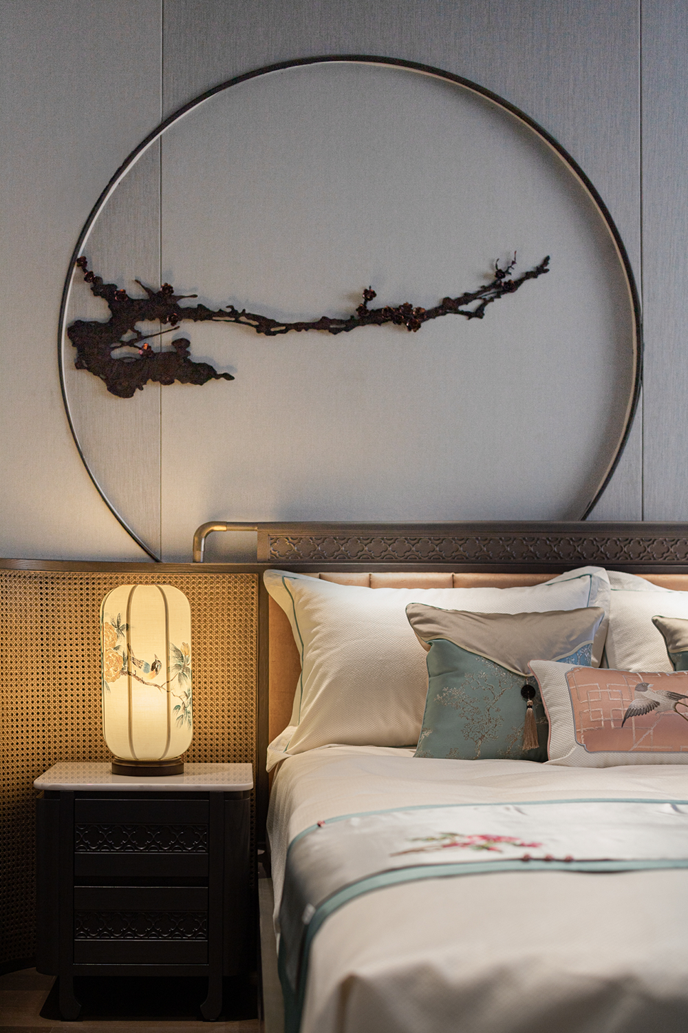 弧形屏幕展开,中式木槿。运用曲线和花卉符号来演绎和表达木槿的富贵与美丽。温柔而深邃的氛围反映了文明的辉煌,几只青瓷茶碗展示了空间的休闲尺度,为空间增添了艺术氛围。