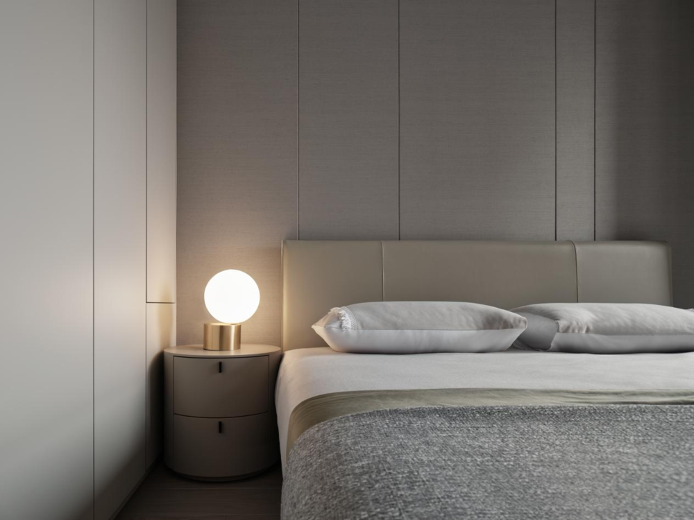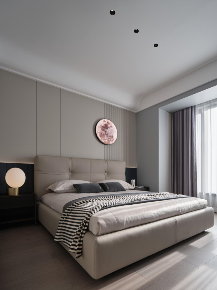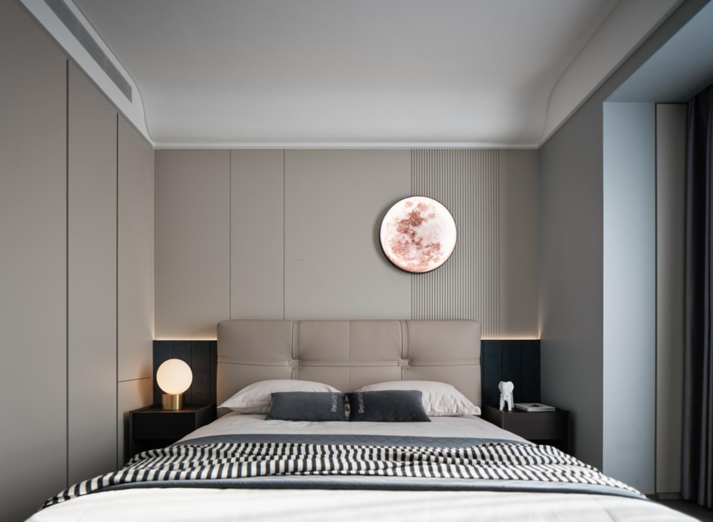 柔软的床上用品,与艺术照明相结合,营造出舒适懒散的空间氛围,让卧室展现出亲切放松的一面。