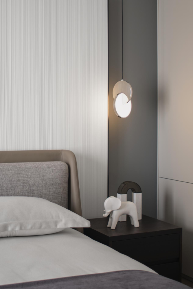 精致柔软的布艺床品,使细节更加高贵,几何金属吊灯点亮整个空间的基调,优雅而随意散落。