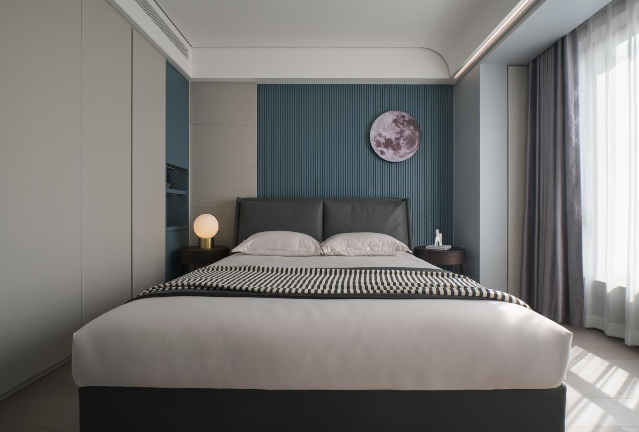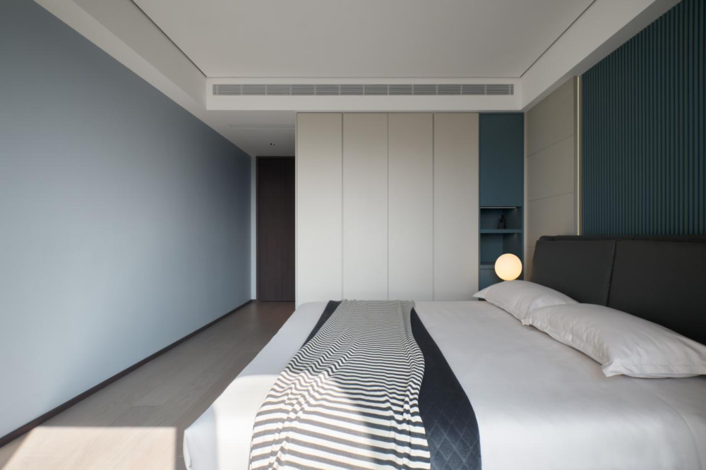 第二卧室空间的蓝灰色调,带着让人一见倾心的莫名舒适感,那是一种自然浪漫戏剧细胞在工作,被浓烈色调包围,蓝色格栅墙板的装饰,让珍贵昂贵赋予了空间奢华却不张扬。