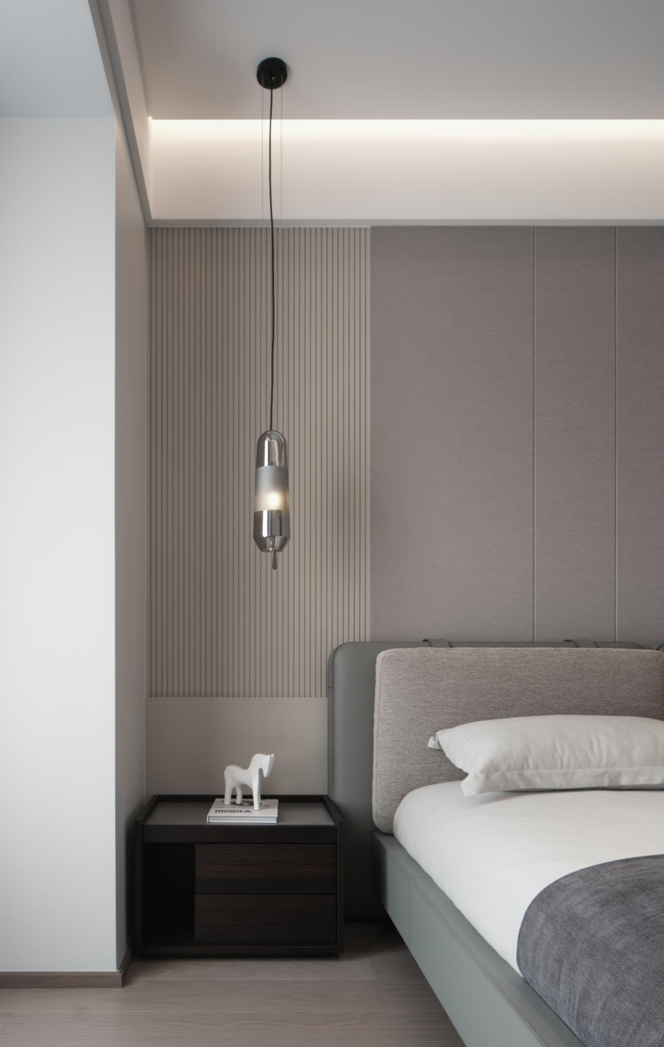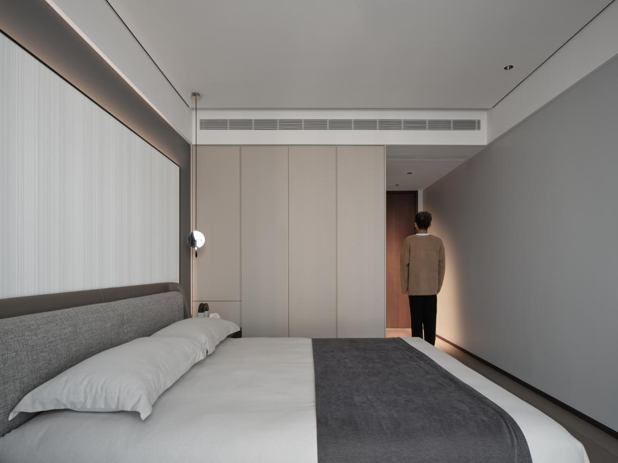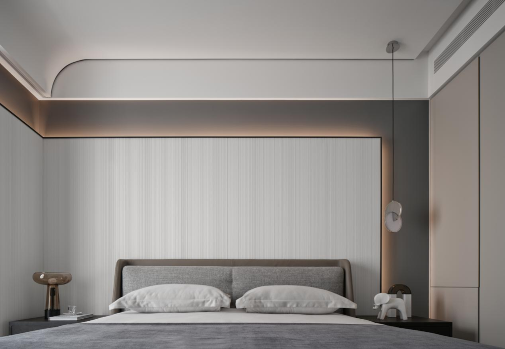 走进主卧室,灵动现代感的店铺设计,引导光线在空间中流动,结合空间顶部的光影层次和后方延展的空间,创造不同光效变化以营造空间层次感。