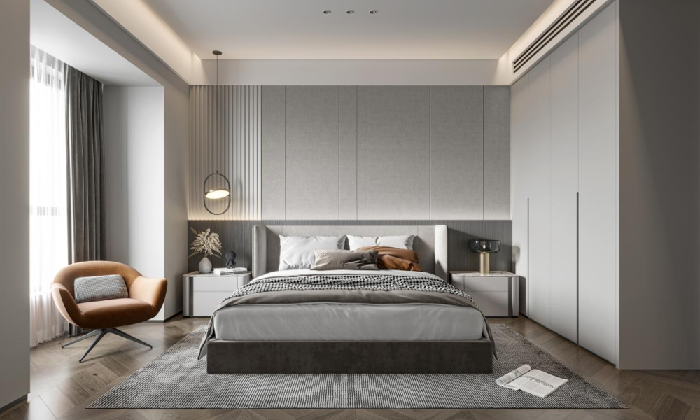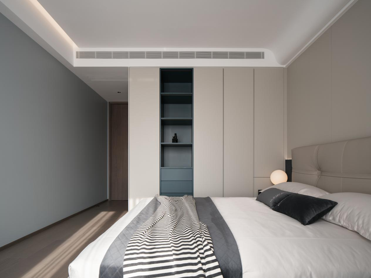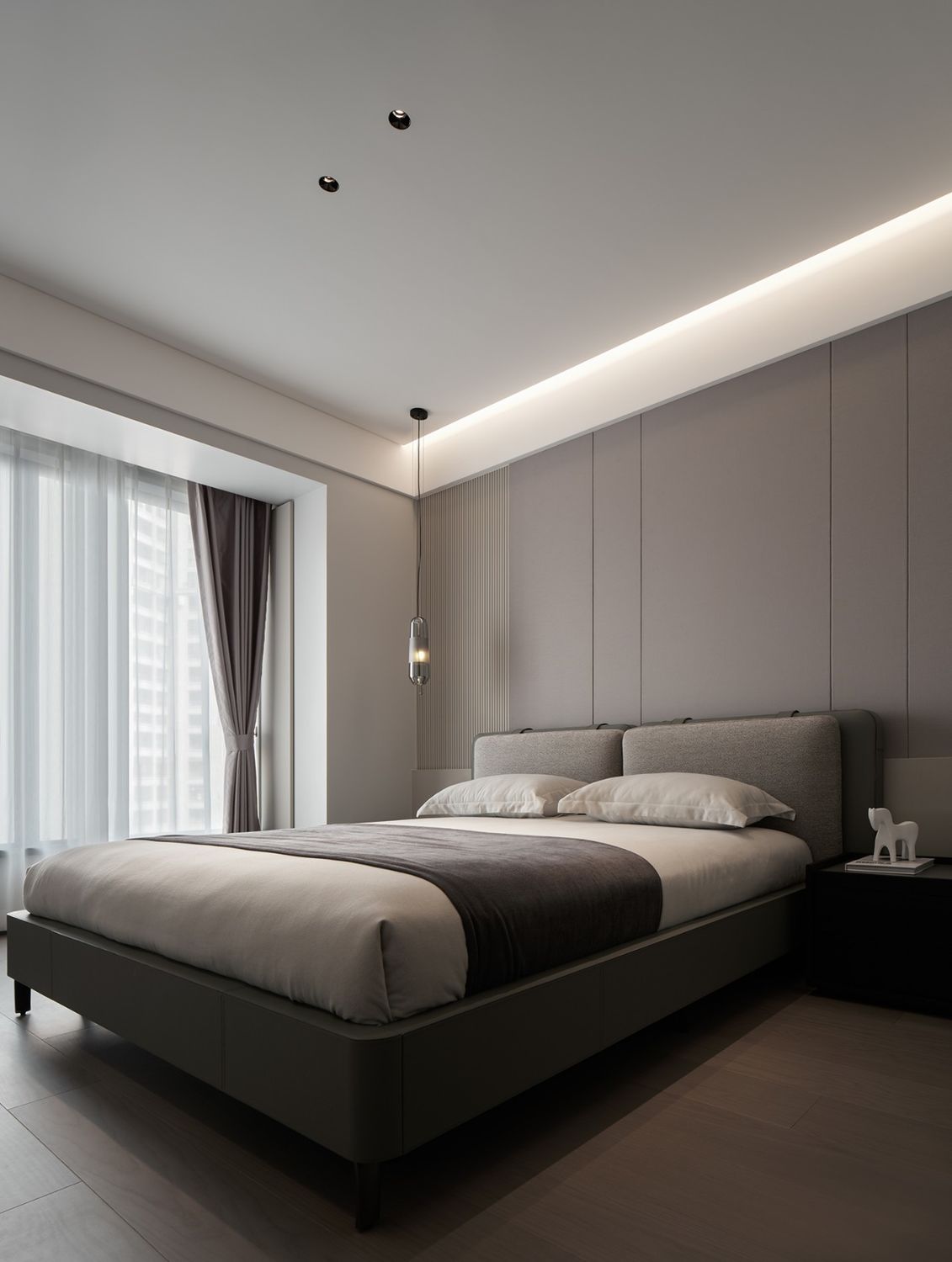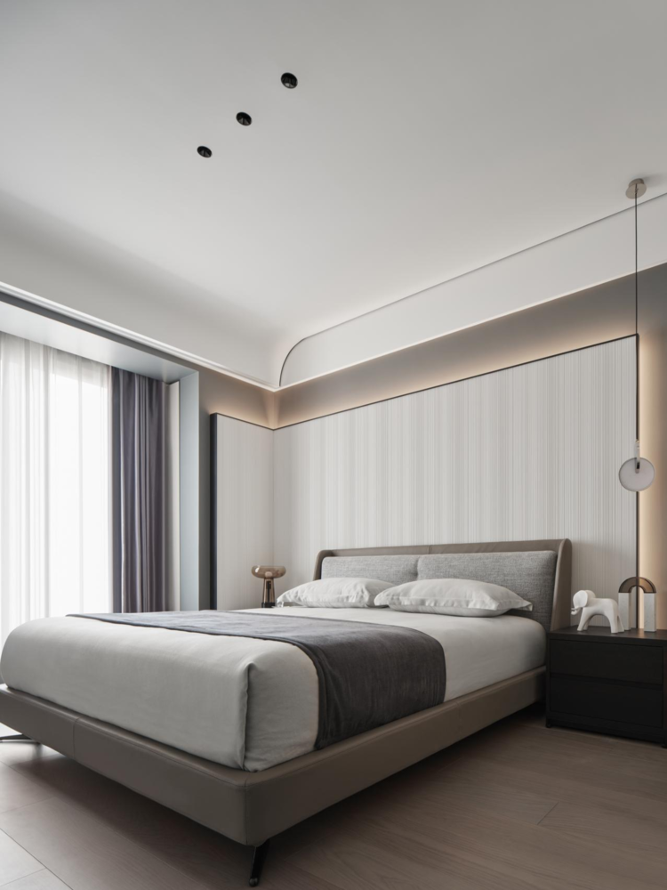 走进主卧室,灵动现代感的店铺设计,引导光线在空间中流动,结合空间顶部的光影层次和后方延展的空间,创造不同光效变化以营造空间层次感。