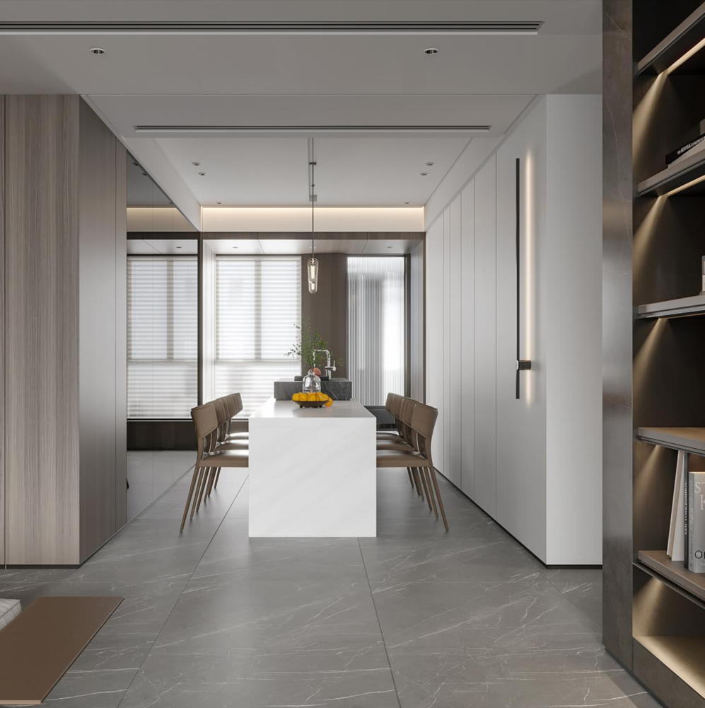 互通的客厅和餐厅布局具有良好的通风和采光优势,在灰白色空间中,光线附着于空间形成一系列变化的阴影和纹理,深邃而强烈。