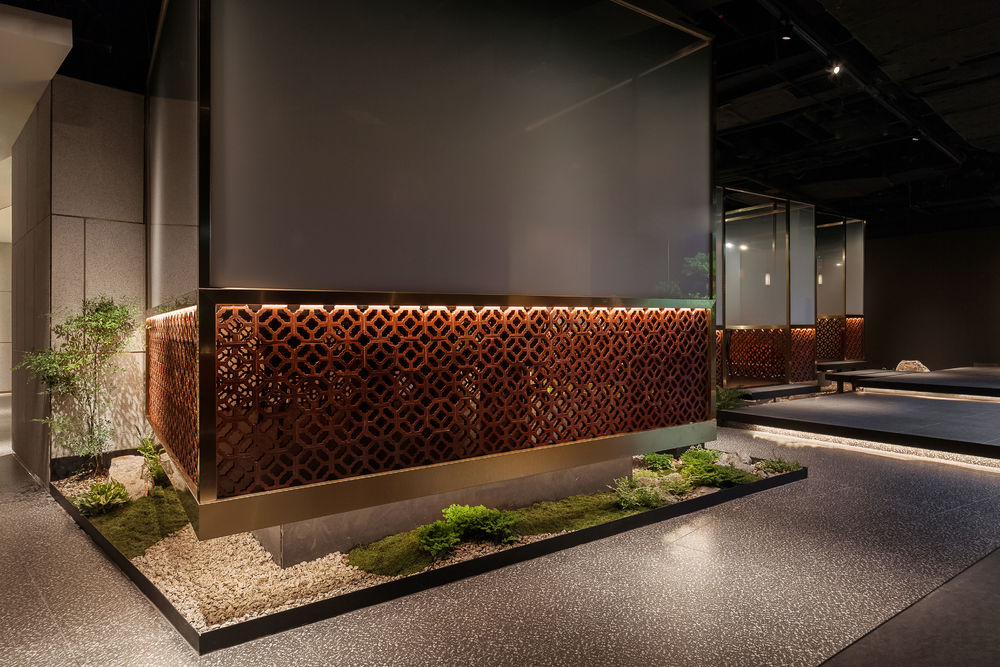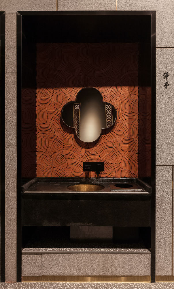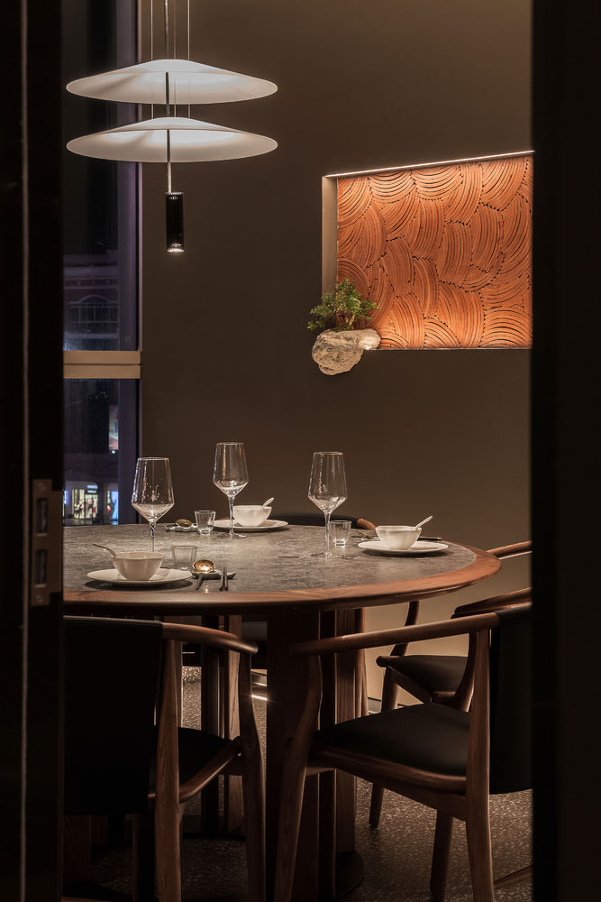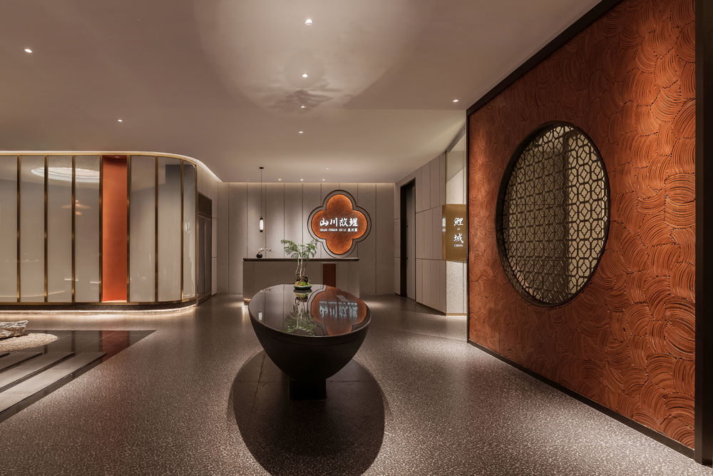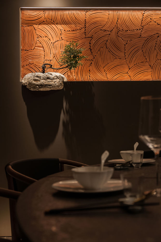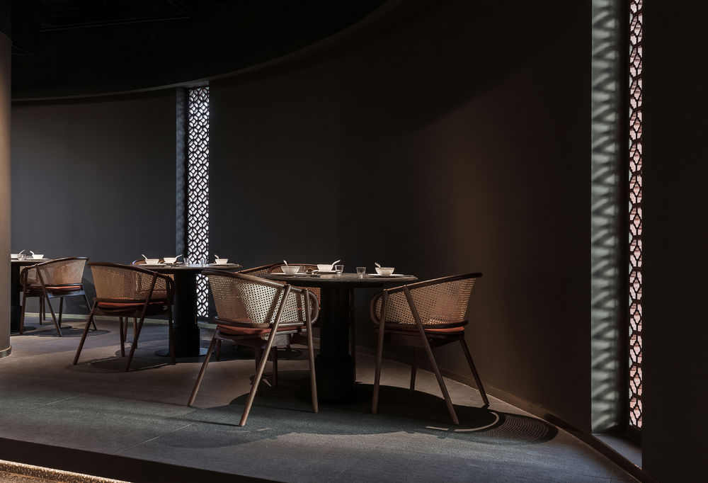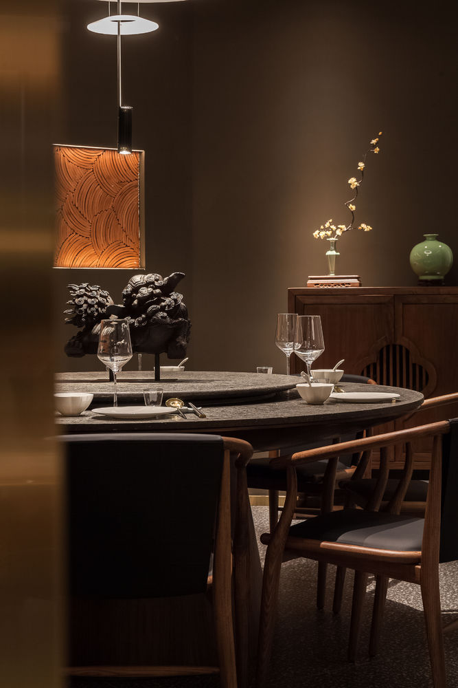 在餐厅入口处,中央大厅建有一面红砖瓦隔断屏风,屏风后面是大厅。中厅是接待客人的空间,因此这里放置了接待茶几。入口屏风与接待厅的布局也是古代南福建人所强调的建筑布局。设计师不仅提炼了传统闽南建筑文化的精髓,还以新时代的审美气质设计并构建出新的空间体验。整体空间呈现出独特的对称美,同时也包含了紧张与放松之间的变化,无意中揭示了闽南建筑记忆。