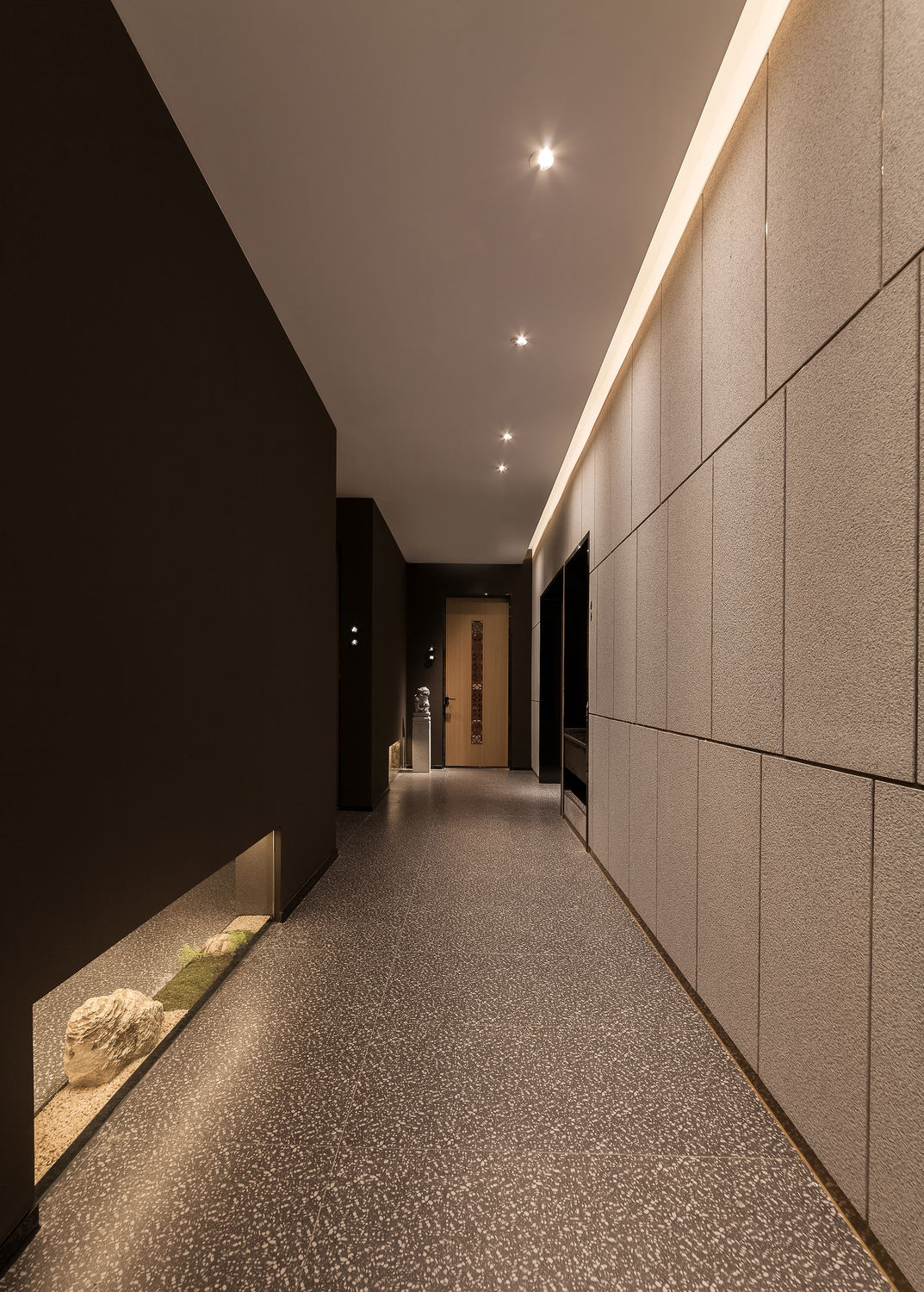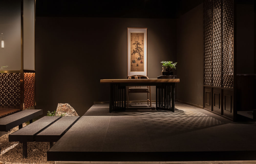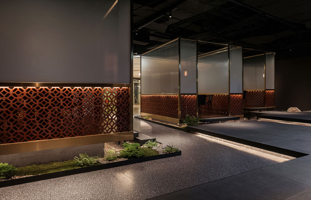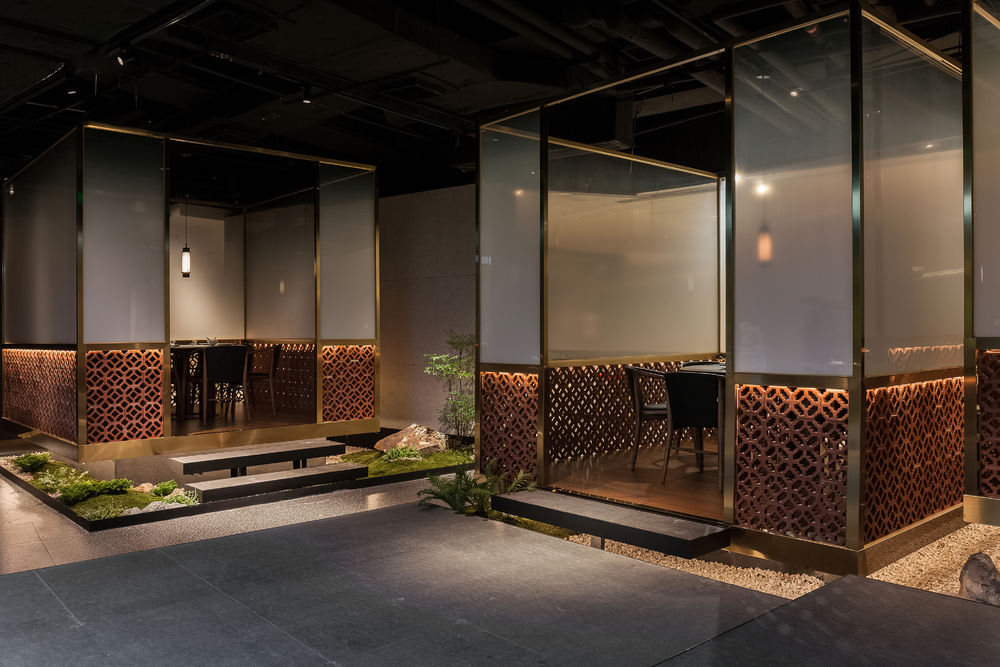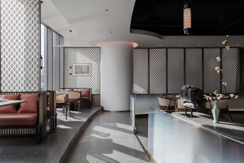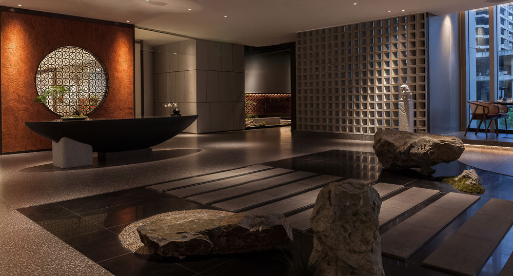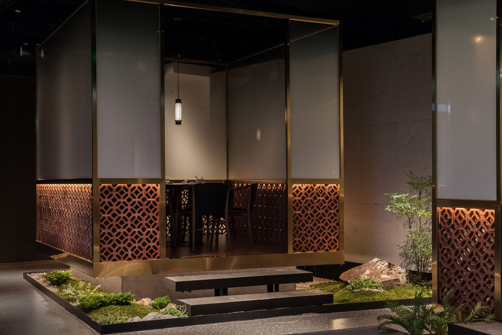 在餐厅入口处,中央大厅建有一面红砖瓦隔断屏风,屏风后面是大厅。中厅是接待客人的空间,因此这里放置了接待茶几。入口屏风与接待厅的布局也是古代南福建人所强调的建筑布局。设计师不仅提炼了传统闽南建筑文化的精髓,还以新时代的审美气质设计并构建出新的空间体验。整体空间呈现出独特的对称美,同时也包含了紧张与放松之间的变化,无意中揭示了闽南建筑记忆。