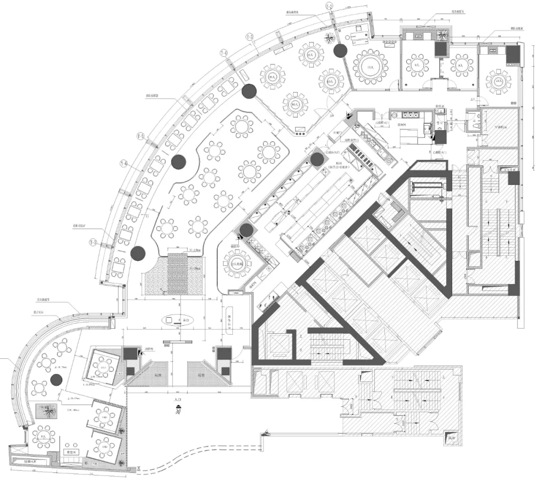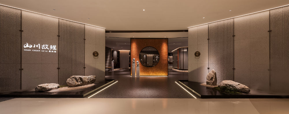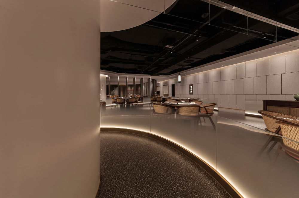南福建建筑空间的构成强调与中央轴线的对称。本案例中入口大门的凹形设计也在中央轴线两侧均匀分布。中央轴线两侧是餐厅的外部形象墙,像一扇敞开的门,欢迎客人。